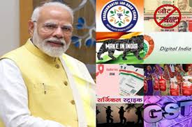 - जीएसटी : मोदी सरकार के प्रमुख फैसलों में जीएसटी को लागू करना शामिल है। मोदी कैबिनेट के वित्त मंत्री अरुण जेटली ने एक जुलाई, 2017 को जीएसटी (वस्तु एवं सेवा कर) लागू किया। इसके अंतर्गत चार जीएसटी स्लैब 5 प्रतिशत, 12 5 प्रतिशत, 18 5 प्रतिशत, और 28 5 प्रतिशत, को इंट्रोड्यूस किया गया। पीएम की एक और महत्वाकांक्षी योजना आयुष्मान भारत योजना भी उनके महत्वपूर्ण फैसलों में शामिल है। इसके अंतर्गत लाभार्थियों को पांच लाख रुपए तक सालाना मुफ्त इलाज की सुव?िधा मिलती है। हाल ही में इस क्षेत्र में 70 वर्ष से अधिक आयु वाले सभी लोगों को शामिल किया गया है।