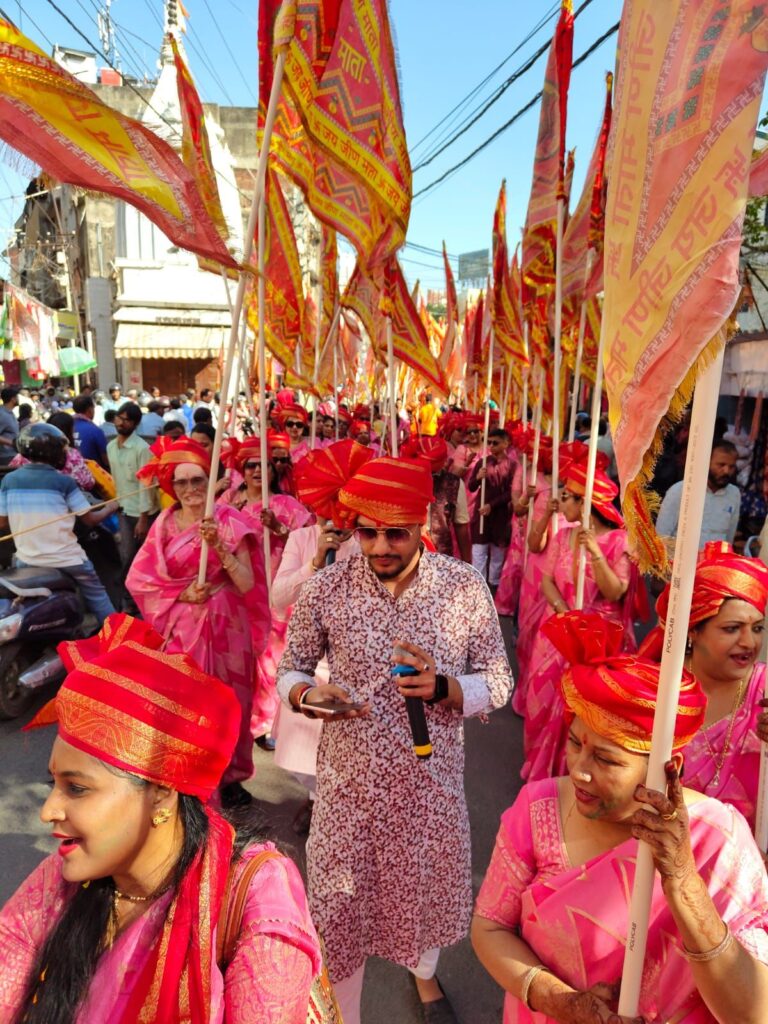 शोभायात्रा में 501 महिलाएं, पुरुष और युवतियां निशान लिए चल रहे थे। जीण धाम से पधारे आनंद पाराशर एवं भागलपुर से राहुल सोनी ने अपनों भजनों से गंगा की लहर बरसा दी।