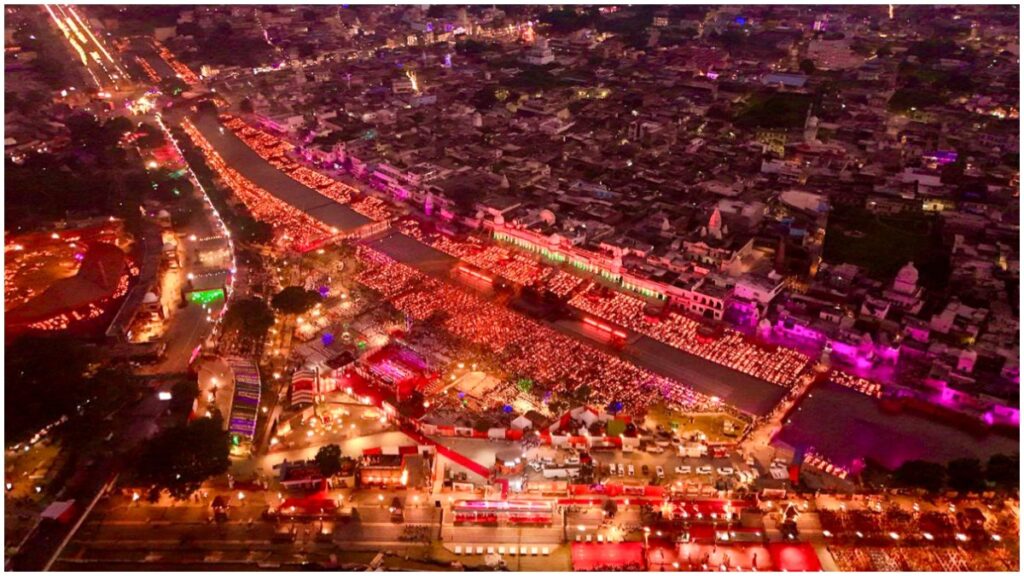 राम की पैड़ी पर दीपों का सागर उमड़ पड़ा। 1100 ड्रोन से आसमान में लेजर शो के जरिए रामायण के प्रसंग जीवंत हुए। ड्रोन तकनीक से दीपों की गिनती कर रिकॉर्ड की पुष्टि की गई। पूरा वातावरण “जय श्रीराम” के जयघोष से गुंजायमान रहा।