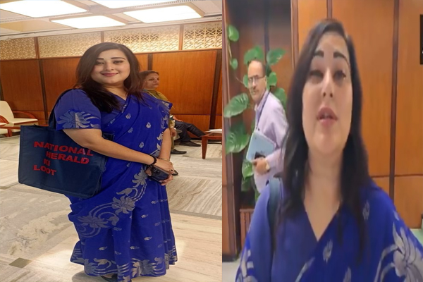 भाजपा सांसद बांसुरी स्वराज के बैग पर लिखा था, ‘नेशनल हेराल्ड की लूट।’