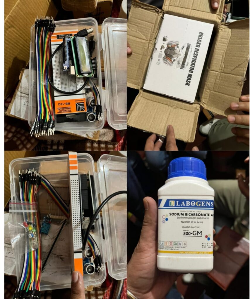 01 देसी कट्टा और 01 जिंदा कारतूस, कॉपर शीट, (हथियार सामग्री), हाइड्रोक्लोरिक एसिड, नाइट्रिक एसिड, सोडियम बाइकाबोर्नेट, सल्फर पाउडर, पीएच वैल्यू चेकर, बॉल बेयरिंग, 4 चाकू,10,500 रुपये नकद, 1 लैपटॉप और 1 मोबाइल फोन, वजन तौलने की मशीन, बीकर सेट, सेफ्टी ग्लव्स, रेस्पिरेटरी मास्क, प्लास्टिक बॉक्स, स्ट्रिप वायर, सर्किट, मदरबोर्ड और डियोड बरामद किए गए हैं।