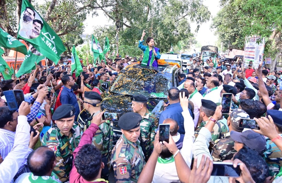 रोड शो के दौरान जगह-जगह स्थानीय लोगों ने फूल-मालाओं से उनका जोरदार स्वागत किया और झामुमो जिÞंदाबाद के नारे लगाते हुए माहौल को पूरी तरह चुनावी रंग में रंग दिया। कल्पना सोरेन के काफिले के गुजरने पर सड़कों के दोनों ओर लोगों की भारी भीड़ उमड़ पड़ी।