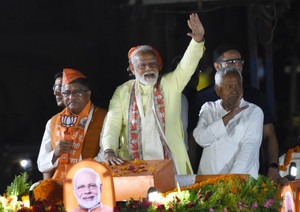 शंखनाद, पुष्प वर्षा और मोदी-मोदी के नारों के बीच उनका काफिला आगे बढ़ रहा है । सड़क के दोनों छोर पर और आसपास के भवनों पर भी बड़ी संख्या में लोग प्रधानमंत्री नरेंद्र मोदी का हाथ हिलाकर अभिवादन कर रहे हैं। प्रधानमंत्री भी इन अभिवादनों का जवाब दे रहे हैं । प्रधानमंत्री जिस केसरिया वाहन पर सवार हैं उसके आगे आगे भाजपा की महिला कार्यकर्ता केसरिया साड़ी और साफा बांधकर चल रही थी।