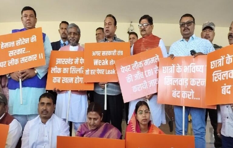 रांची। झारखंड विधानसभा के बजट सत्र का आज दूसरा दिन है। सत्र से पहले भाजपा विधायकों ने सदन के बाहर मैट्रिक परीक्षा पेपर लीक मामले को लेकर प्रदर्शन किया। विधायकों ने हाथों में बैनर पोस्टर लेकर प्रदेश की हेमंत सरकार के खिलाफ नारेबाजी की। भाजपा नेताओं ने आरोप लगाते हुए कहा कि छात्रों के भविष्य के साथ खिलवाड़ हो रहा है। झारखंड की हेमंत सोरेन सरकार में जितनी परीक्षाएं होती हैं सभी परीक्षाओं में पेपर लीक हो जाता है। विधायकों ने पेपर लीक की जांच सीबीआई से कराने की मांग की।