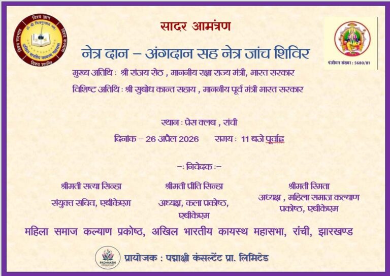 रांची। आगामी 26 अप्रैल को प्रेस क्लब में नेत्रदान – अंगदान सह नेत्र जांच शिविर का आयोजन किया जाएगा। अखिल भारतीय कायस्थ महासभा की समाज कल्याण ( महिला ) व कला प्रकोष्ठ की ओर से आयोजित होने वाले कार्यक्रम का समय प्रातः 11 बजे से 1 बजे दोपहर तक रखा गया है । कार्यक्रम में संजय सेठ रक्षा राज्य मंत्री (भारत सरकार ) बतौर मुख्य अतिथि एवं सुबोधकान्त सहाय ( पूर्व मंत्री, भारत सरकार ) बतौर विशिष्ट अतिथि मौजूद रहेंगे। कार्यक्रम के आयोजन में रिम्स की आई बैंक एवं स्टेट ऑर्गन एंड टिश्यू ट्रांसप्लांट ऑर्गनाइजेशन ( सोटो ), झारखंड महत्वपूर्ण भूमिका निभा रही। इस शिविर में लोगों की निःशुल्क नेत्र जांच की जाएगी। साथ ही इच्छुक व्यक्ति नेत्रदान व अंगदान के लिए रजिस्ट्रेशन करवा सकते हैं। नेत्रदान व अंगदान के इच्छुक व्यक्तियों को कार्यक्रम में सम्मानित भी किया जाएगा।