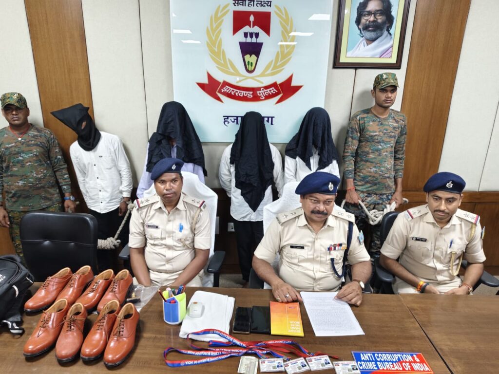 हजारीबाग। पुलिस ने चार ठगों को गिरफ्तार किया। फर्जी एसीबी अधिकारी बनकर मेडिकल स्टोर संचालकों से अवैध वसूली कर रहे थे। घटना कटकमसांडी थाना क्षेत्र के डांटो खुर्द गांव की है। एडिशनल एसपी अमित कुमार ने गुरुवार को बताया कि चार लोग स्कॉर्पियो में सवार होकर मेडिकल स्टोर पहुंचे। सभी ने फॉर्मल कपड़े पहने थे और गले में नकली पहचान पत्र और पैरों में पुलिस के लाल जूते पहने थे। गिरफ्तार आरोपितों में हजारीबाग के खिरगांव निवासी नंदूवीर राम, सिल्वर निवासी धनेसर राम, बोकारो के गोमिया निवासी महेश पासवान और चतरा स्थित गिद्धौर के रहने वाले अयोध्या पासवान शामिल हैं।