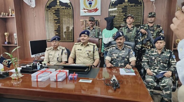 गुमला। नेतरहाट घाटी में सिपाही अभिषेक कुमार की हत्या करने समेत गुरदरी थाना के कई कांडों के वांछित अपराधी झांगुर गुट का सक्रिय सदस्य विशुनपुर थाना क्षेत्र के रोपाकोना गांव निवासी अरविंद उरांव उर्फ झुनझुन उरांव को गुमला पुलिस ने संयुक्त छापामारी अभियान चलाकर गिरफ्तार किया। गिरफ्तार अपराधी के पास से एक 9 एमएम का पिस्टल पांच रांड मैगजीन लगा हुआ, एक देशी कट्टा, 9 एमएम का दो खोखा, बरामद किया है।