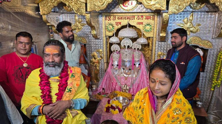 आगर मालवा। मुख्यमंत्री हेमंत सोरेन पत्नी कल्पना सौरन के साथ मंगलवार को आगरमालवा जिले के नलखेड़ा स्थित विश्व प्रसिद्ध पीताम्बरा सिद्धपीठ माँ बगलामुखी मंदिर आये।