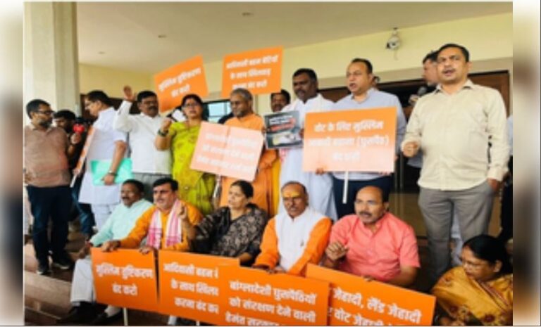 रांची । झारखंड विधानसभा के मानसून सत्र के दूसरे दिन सोमवार को सदन के अंदर और बाहर भाजपा विधायकों ने राज्य में बांग्लादेशी घुसपैठ, मुस्लिम तुष्टिकरण और पाकुड़ के कॉलेज हॉस्टल के छात्रों की पुलिस द्वारा पिटाई के मुद्दे पर जोरदार हंगामा किया। सदन के मुख्य द्वार पर भी विधायकों ने इन मुद्दों से जुड़ी तख्तियां लेकर नारे लगाए और धरना दिया।