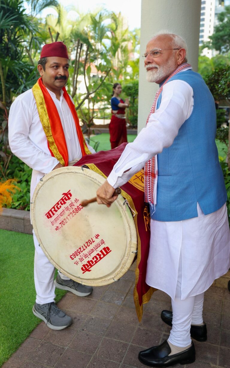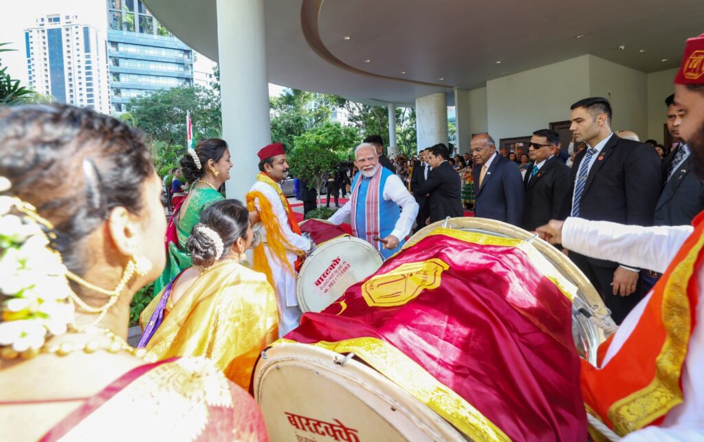 सिंगापुर पहुंचने पर प्रधानमंत्री मोदी का अलग ही अंदाज देखने को मिला। वे महाराष्ट्र के रंग में रंगे नजर आए। पीएम मोदी ने वहां मौजूद कलाकारों के साथ महाराष्ट्रियन धुन पर जमकर ढोल बजाया। इतना ही नहीं वो खुद ढोल बजाकर प्रवासी भारतीयों के साथ झूमते हुए भी दिखे। प्रधानमंत्री का यह वीडियो सोशल मीडिया पर छाया हुआ है। इस वीडियो पर सोशल मीडिया यूजर्स अलग-अलग रिएक्शन भी दे रहे हैं।