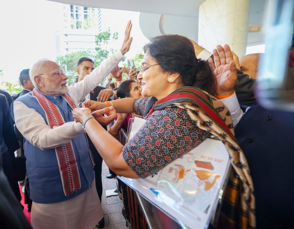 सिंगापुर के होटल के बाहर से पीएम मोदी का एक और वीडियो सामने आया है। जिसमें एक महिला प्रधानमंत्री मोदी को राखी बांध रही है। इसके अलावा पीएम मोदी के साथ सेल्फी लेने के लिए लोगों में काफी होड़ भी दिखाई दी। पीएम मोदी जिस होटल में ठहर रहे हैं, वहां मौजूद एक शख्स को उन्होंने आॅटोग्राफ भी दिया।