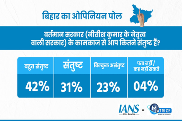 आईएएनएस-मैटराइज सर्वे में सबसे पहले एनडीए के नेतृत्व वाली नीतीश सरकार के कामकाज से कितने लोग संतुष्ट है इस पर राय ली गई तो 42 प्रतिशत जनता ने नीतीश कुमार के कामकाज पर बहुत संतुष्टि जताई है। वहीं, 31 प्रतिशत लोग उनके काम से संतुष्ट नजर आ रहे हैं, जबकि 23 प्रतिशत लोगों उनके काम से खुश नहीं दिख रहे और असंतुष्ट नजर आ रहे हैं है। वहीं 4 प्रतिशत लोगों ने इस पर कोई राय नहीं दी है।