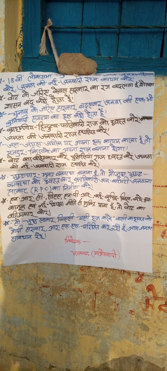माओवादियों के जरिये लगाए गए हस्तलिखित पोस्टर में 18 वीं लोकसभा चुनाव को बहिष्कार करने, जनता की नई जनवादी राज कायम करने, वोट के जरिए केवल सरकार का रंग बदलता है। शोषण और शासन बंद नहीं होता है। चुनाव के जरिए सरकार बदलकर जनता की एक भी बुनियादी समस्या का हल नहीं होता है। ब्राह्मणीय- हिंदुत्व- फासीवाद राज को ध्वस्त करो, जनता की जनवादी राज स्थापित करो, जल, जंगल, जमीन पर अपना हक कायम करना है तो मजदूर किसानों का अपना राज बनाना होगा। वोट बहिष्कार करें। पुलिसिया राज ध्वस्त करें। जनता की नई जनवादी राज स्थापित करें। भ्रष्टाचार मुक्त व्यवस्था बनाना है तो मौजूदा भ्रष्ट व्यवस्था को ध्वस्त कर क्रांतिकारी जन कमेटी जनताना सरकार (आरपीसी) का निर्माण करें। एनआरसी, सीसीए, एनपीआर, नई कृषि बिल, नए श्रम कानून एवं नई शिक्षा नीति से मुक्ति पाना है तो वोट का बहिष्कार करें। सौ चूहा खाकर बिल्ली चली हज करने वाली कहावत को मोदी सरकार, आरएसएस चरितार्थ कर रही है। आम जनता सावधान रहें।