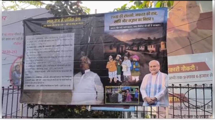 पटना । बिहार की राजधानी पटना में बुधवार को पोस्टर के जरिए राजद के शासनकाल में धार्मिक उन्माद से तनाव फैलाने का आरोप लगाते हुए निशाना साधा गया।