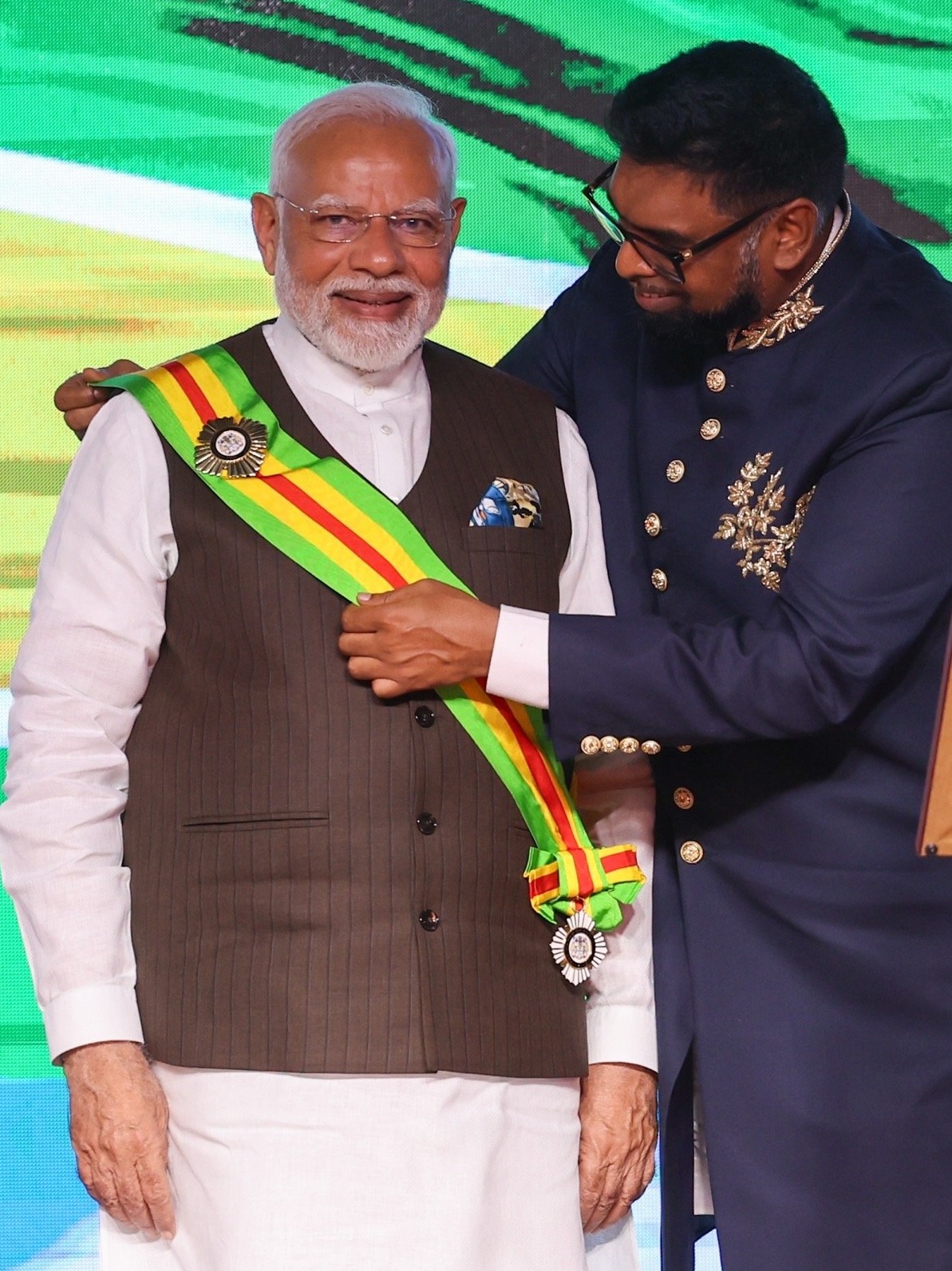 स्टेट हाउस में आयोजित एक समारोह में गुयाना के राष्ट्रपति डॉ. मोहम्मद इरफ़ान अली ने प्रधानमंत्री श्री मोदी को उनकी दूरदर्शी प्रतिभा और वैश्विक मंच पर विकासशील देशों के अधिकारों की वकालत करने के लिए, वैश्विक समुदाय के लिए असाधारण सेवा के लिए और भारत-गुयाना संबंधों को मजबूत करने की उनकी प्रतिबद्धता के लिए गुयाना के सर्वोच्च राष्ट्रीय पुरस्कार,’द ऑर्डर ऑफ एक्सीलेंस’ से सम्मानित किया।