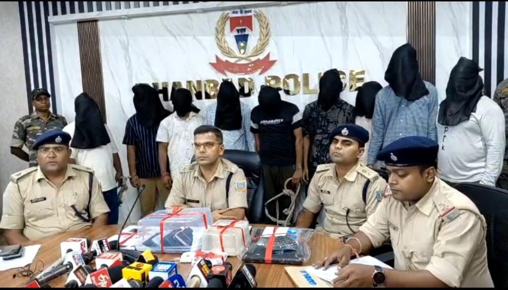 धनबाद। धनबाद पुलिस ने साइबर अपराध के खिलाफ बड़ी कार्रवाई करते हुए बैंकमोड़ थाना क्षेत्र स्थित द होटल कैसल में छापेमारी कर नौ साइबर अपराधियों को गिरफ्तार किया है। पुलिस ने मौके से पांच लाख 80 हजार 700 रुपये नकद, 17 मोबाइल फोन, 23 अलग-अलग बैंकों के एटीएम कार्ड, एक एप्पल आईपैड और एक डेल लैपटॉप भी जब्त किया है।