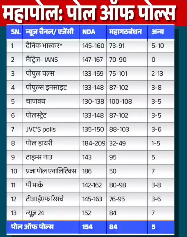 पोलस्टर पीपुल्स पल्स : पोलस्टर पीपुल्स पल्स ने भी बिहार विधानसभा चुनावों के लिए एग्जिट पोल अनुमान जारी किया है। इसके मुताबिक चुनाव में एनडीए को 133-159, महागठबंधन को 75-101, जन सुराज को 0-5 और अन्य को 2-8 सीट मिलने की उम्मीद है।
