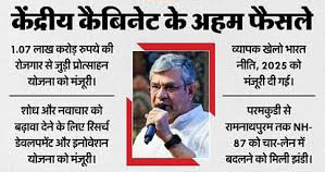कैबिनेट ने नेशनल स्पोर्ट्स पॉलिसी 2025 को भी मंजूरी दी है। यह पॉलिसी 2001 में बनी पॉलिसी की जगह लेगी। इसके अलावा सरकार ने तमिलनाडु में परमकुडी-रामनाथपुरम नेशनल हाईवे सेक्शन को चार लेन का बनाने की मंजूरी दी है। इस प्रोजेक्ट पर 1,853 करोड़ रुपये खर्च होंगे। यह कदम सड़क व्यवस्था को सुधारने, कनेक्टिविटी बढ़ाने और क्षेत्रीय अर्थव्यवस्था को बढ़ावा देने के लिए उठाया गया है।