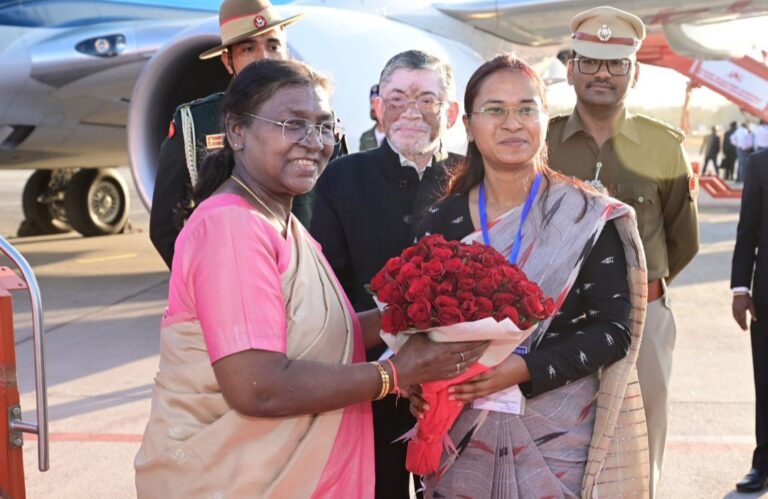 रांची। राष्ट्रपति द्रौपदी मुर्मू अपने दो दिवसीय झारखंड दौरे पर शुक्रवार को रांची पहुंची। रांची एयरपोर्ट पर राज्यपाल संतोष कुमार गंगवार और कृषि मंत्री शिल्पी नेहा तिर्की सहित अन्य अधिकारियों ने एयरपोर्ट पर उनका स्वागत किया।