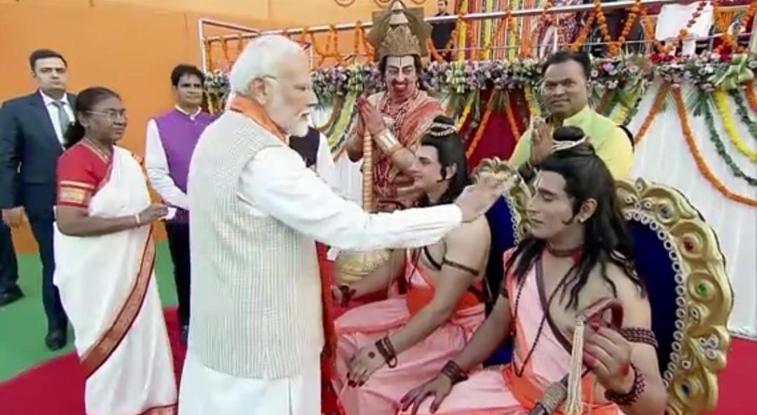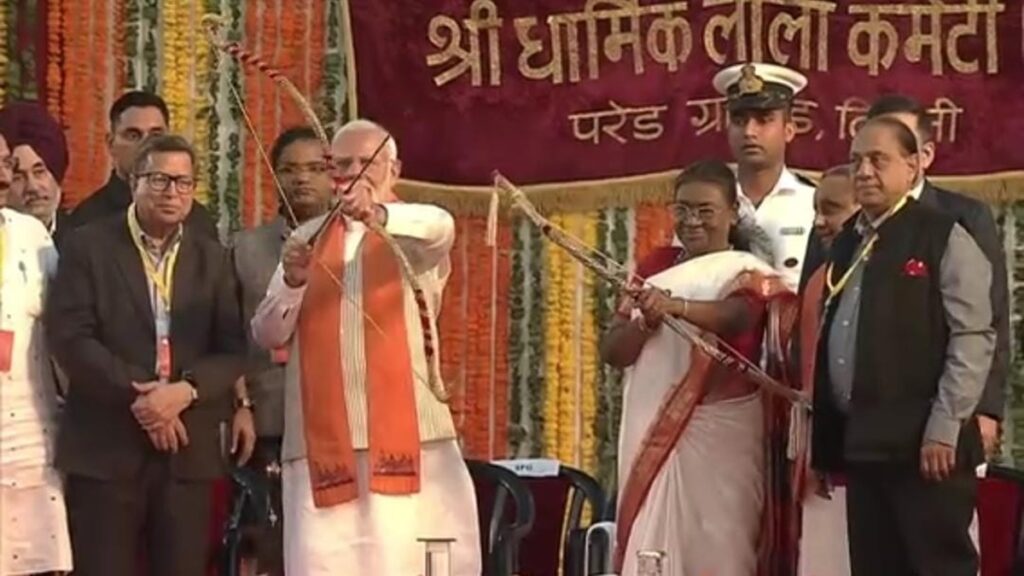 नई दिल्ली। बुराई पर अच्छाई का प्रतीक पर दहशरा (Dussehra) पर राष्ट्रपति द्रौपदी मुर्मु, प्रधानमंत्री नरेंद्र मोदी ने रावण को तीर मारा और उसका दहन शुरू हो गया। दिल्ली में लालकिला स्थित माधव पार्क में रावण, कुंभकर्ण और मेघनाथ का पूतला धू-धूकर जल गया। माधव दास पार्क में श्री धार्मिक रामलीला कमेटी में राष्ट्रपति (President Draupadi Murmu) और प्रधानमंत्री (PM Modi) ने पहुंचकर रामलीला मंच पर शाम को भगवान राम और लक्ष्मण की भूमिका निभाने वाले कलाकारों के माथे पर तिलक लगाया।