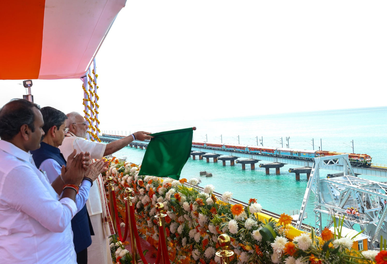 नई दिल्ली । प्रधानमंत्री नरेन्द्र मोदी ने रविवार को तमिलनाडु के रामेश्वरम में भारत के पहले वर्टिकल लिफ्ट सी ब्रिज और रामेश्वरम -तांबरम (चेन्नई) नई ट्रेन सेवा और एक तटरक्षक जहाज की शुरुआत की। पंबन सी ब्रिज मुख्य भूमि और रामेश्वरम द्वीप के बीच एक रेल लिंक प्रदान करेगा। कार्यक्रम में तमिलनाडु के राज्यपाल आरएन रवि और रेल मंत्री अश्वनी वैष्णव भी मौजूद रहे।