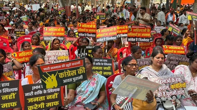 रांची। लोकसभा में महिला आरक्षण बिल पारित नहीं होने के विरोध में भारतीय जनता पार्टी ने शनिवार को आक्रोश मार्च का आयोजन किया। हाथों में कांग्रेस और झामुमो पर महिला विरोधी होने की तख्तियां लिए हजारों महिलाएं रांची के मोरहाबादी मैदान से अल्बर्ट एक्का चौक तक पहुंची। आदित्य साहू के प्रदेश अध्यक्ष बनने के बाद भाजपा का यह पहला सार्वजनिक कार्यक्रम था। भाजपा के सभी बड़े नेता इसमें मौजूद रहे। हालांकि मंच पर राज्य भर की महिला नेत्रियों को ही स्थान दिया गया।खास बात यह रही कि पद्मश्री छुटकी महतो और जमुना टुडू ने भी मंच से महिलाओं को अधिकार नहीं देने के सवाल पर कांग्रेस को घेरा। प्रदेश अध्यक्ष आदित्य साहू ने कहा कि गांव घर में जब कांग्रेस के नेता जाएंगे तो महिलाएं उनसे अपने साथ हुए धोखे का सवाल पूछेंगी। उन्होंने कहा कि केंद्र की नरेन्द्र मोदी सरकार महिलाओं को विधायिका में 50 प्रतिशत आरक्षण देने के लिए तैयार थी। लेकिन कांग्रेस को देश में महिलाओं को मजबूत होते देखना अच्छा नहीं लगा।प्रदेश भाजपा अध्यक्ष आदित्य साहू ने कहा कि रांची में निकली यह आक्रोश रैली गांव तक जाएगी। मंडल स्तर पर भाजपा की महिला कार्यकर्ता कांग्रेस को बेनकाब करेंगी। रैली में शामिल होने आई महिलाओं ने भी कांग्रेस पर सवाल उठाए।रामगढ़ जिले के चितरपुर से आईं साबो महतो ने कहा कि कांग्रेस और झामुमो मंइयां सम्मान का झूठा दिखावा करती हैं। संसद और विधानसभा में महिलाओं की संख्या बढ़ाने में प्रधानमंत्री नरेन्द्र मोदी के प्रयासों को कांग्रेस गठबंधन ने तोड़ दिया है।आक्रोश रैली के मंच पर एक के बाद एक महिला नेताओं का संबोधन होता रहा। जबकि नीचे पूर्व मुख्यमंत्री अर्जुन मुंडा, मधु कोड़ा, नेता प्रतिपक्ष बाबूलाल मरांडी, रक्षा राज्यमंत्री संजय सेठ, पूर्व अध्यक्ष पीएम सिंह समेत वरिष्ठ नेता बैठकर भाषण सुनते रहे। भाजपा नेता बाबूलाल मरांडी ने कहा कि यह कार्यक्रम महिलाओं का है। प्रधानमंत्री नरेन्द्र मोदी ने देश की महिलाओं को सशक्त करने का अभियान चलाया है।दिन के ग्यारह बजे प्रारंभ हुआ कार्यक्रम दो बजे समाप्त हुआ। मोरहाबादी मैदान में कड़ी धूप के बीच बाहर से आई महिलाएं कुर्सी लेकर छांव तलाशती रहीं। रांची के अलावा बाहर के जिलों से भी अच्छी संख्या में महिलाएं कार्यक्रम में शामिल होने पहुंची थीं। पार्टी के पुरुष कार्यकर्ता और नेता महिलाओं को सत्तू शर्बत और पानी पिला रहे थे। संगठन महामंत्री कर्मवीर सिंह और प्रदेश अध्यक्ष आदित्य साहू घूम घूमकर एक एक कार्यकर्ता का हालचाल पूछते रहे।