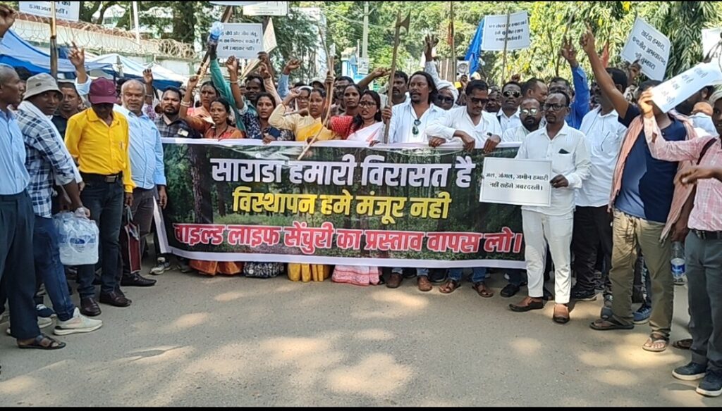 चाईबासा। पश्चिमी सिंहभूम जिला स्थित सारंडा को वाइल्ड लाइफ सेंचुरी घोषित किए जाने के प्रस्ताव के खिलाफ मंगलवार को जिले में विशाल महा जन आक्रोश रैली निकाली गई। आदिवासी मुंडा समाज विकास समिति, आदिवासी मूलवासी समिति, कोल्हान रक्षा संघ सहित दर्जनों सामाजिक संगठनों के बैनर तले हजारों ग्रामीण वेशभूषा और पारंपरिक हथियारों के साथ सड़कों पर उतरे। भीड़ हाथों में तख्तियां, झंडे और बैनर लिए हुए यह जंगल हमारा है, यह पेड़ हमारा है के नारे लगाते हुए आगे बढ़ रही थी।