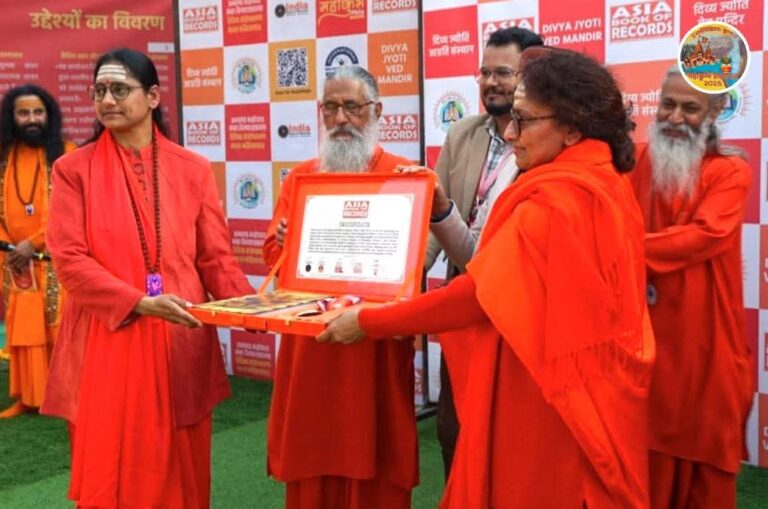 महाकुम्भ नगर। प्रयागराज महाकुम्भ मेला में दिव्य ज्योति जाग्रति संस्थान शिविर में 504 ब्रह्मज्ञानी विद्वानों ने लगातार वैदिक मंत्रों का जाप कर रविवार को विश्व रिकॉर्ड बनाया। एशिया बुक ऑफ रिकॉर्ड्स और इंडिया बुक ऑफ रिकॉर्ड्स टीम के अधिकारियों ने जाग्रति संस्थान को इसका प्रमाण पत्र दिया।