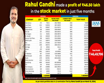 राहुल गांधी को बीते करीब पांच महीने में शेयर बाजार से 46.49 लाख रुपये का मुनाफा हुआ है। यह मुनाफा उनकी ओर से रायबरेली लोकसभा के लिए भरे गए चुनावी नामांकन में दर्ज शेयरों के आधार पर कैलकुलेट किया गया है, जिसमें बताया गया था कि 15 मार्च, 2024 को उनके पोर्टफोलियो की वैल्यू 4.33 करोड़ रुपये थी। शेयर बाजार में 12 अगस्त, 2024 तक उनके पोर्टफोलियो की कीमत बढ़कर 4.80 करोड़ रुपये हो गई है। राहुल गांधी के पोर्टफोलियो में एशियन पेंट्स, बजाज फाइनेंस, दीपक नाइट्रेट, डिवीज लैब्स, जीएमएम फॉडलर, हिंदुस्तान यूनिलीवर, इन्फोसिस, आईटीसी, टीसीएस, टाइटन, ट्यूब इन्वेस्टमेंट और एलटीआई माइंडट्री जैसे शेयरों के नाम शामिल हैं।