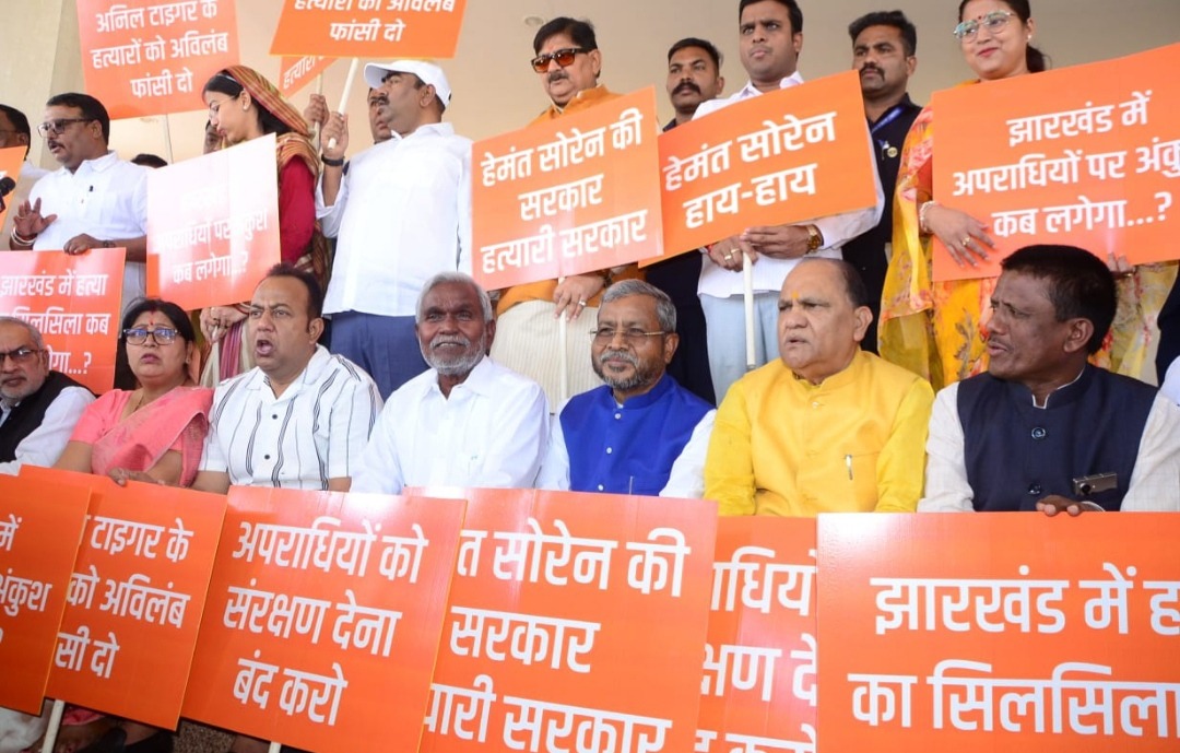 रांची। झारखंड विधानसभा के बजट सत्र के 20वें दिन की कार्यवाही शुरू होने से पहले भाजपा विधायकों ने नेता अनिल टाइगर की हत्या और राज्य की बिगड़ती कानून व्यवस्था के विरोध में सदन के बाहर प्रदर्शन किया।