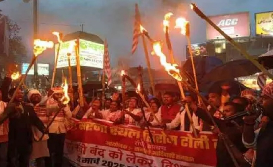 रांची। सिरमटोली सरना स्थल बचाओ मोर्चा के तत्वावधान में विभिन्न आदिवासी संगठनों ने 22 मार्च को संपूर्ण रांची बंद के समर्थन में विशाल मशाल जुलूस निकाला। यह जुलूस जयपाल सिंह मुंडा स्टेडियम से शुरू होकर अल्बर्ट एक्का चौक पर शुक्रवार रात संपन्न हुआ। आदिवासी समाज के विभिन्न संगठनों और सरना समितियों ने कहा कि 22 मार्च का रांची बंद ऐतिहासिक होगा। आदिवासी समाज के लोग अपनी पारंपरिक वेशभूषा में सरना झंडा और तख्तियों के साथ अपनी मांगों को लेकर चौक-चौराहों पर शांतिपूर्ण प्रदर्शन करेंगे।