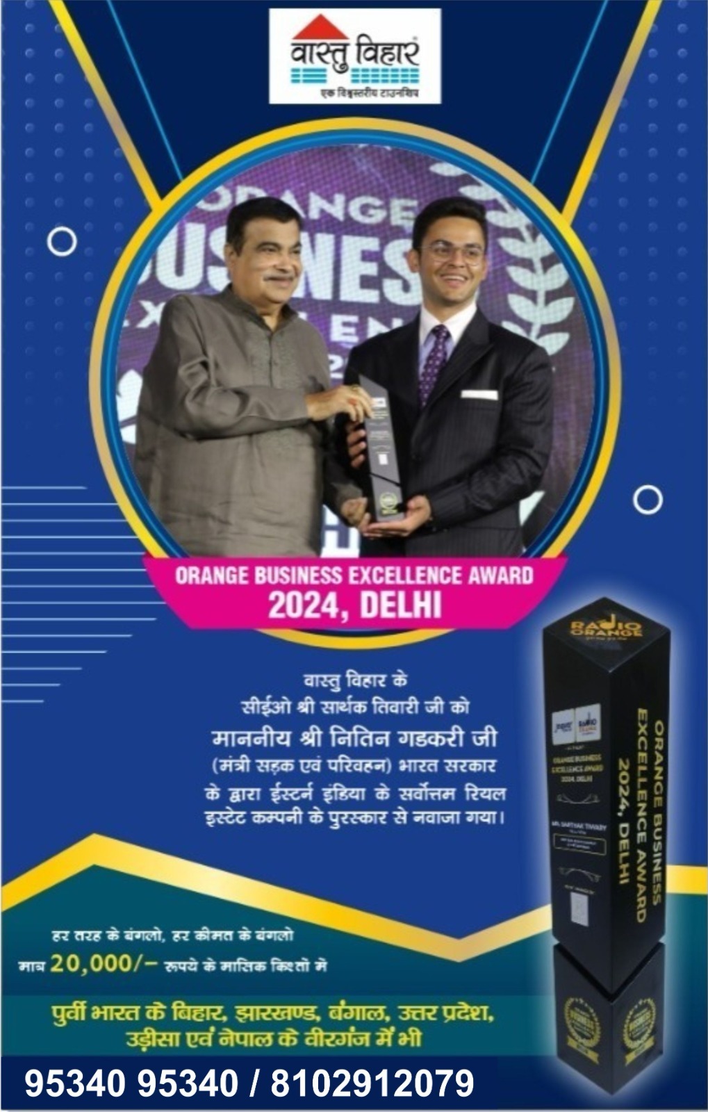 नई दिल्ली। वास्तु बिहार को केंद्रीय सड़क एवं परिहन मंत्री नितिन गडकरी ने ईस्टर्न इंडिया के सर्वोच्च रियल स्टेट अवार्ड से सम्मानित किया। यह पुरस्कार वास्तु विहार के सीइओ सार्थक तिवारी ने लिया।