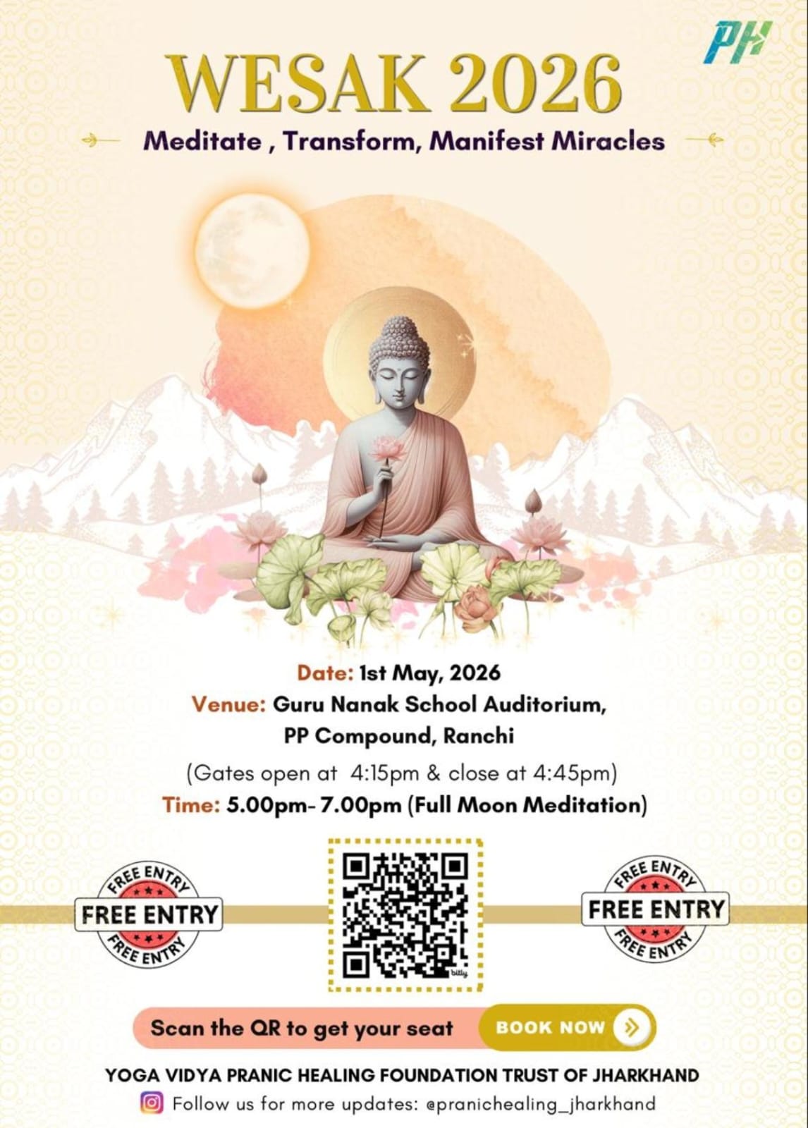रांची। स्थानीय गुरु नानक स्कूल ऑडिटोरियम, पी.पी. कंपाउंड में आगामी 1 मई को ‘वेसाक पूर्णिमा ध्यान’ का आयोजन किया जाएगा। योग विद्या प्राणिक हीलिंग फाउंडेशन ट्रस्ट ऑफ झारखंड की ओर से आयोजित कार्यक्रम का समय का शुभारंभ सायं 4:15 बजे से होगा। कार्यक्रम में प्रवेश पूर्णता निःशुल्क है। कार्यक्रम में योग, ध्यान व उससे जुड़ीं बातें बताई जाएंगी।