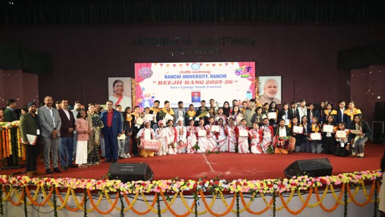 रांची। रांची विश्वपविद्यालय के इंटर कॉलेज युवा महोत्सव रीझ-रंग 2025-26 का शनिवार को समापन हुआ। इस अवसर पर कुल 26 इवेंट्स के विजेताओं को पुरस्कार देकर सम्मानित किया गया। पुरस्कार वितरण समारोह आर्यभट्ट सभागार में आयोजित किया गया। 18 और 19 दिसंबर को संपन्न हुये सभी इवेंट्स के फहले, दूसरे और तीसरे स्थान प्राप्त करनेवाले छात्रों के नामों की घोषणा की गई।
