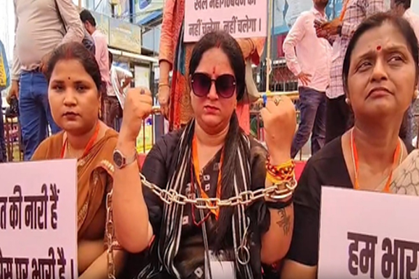 पटना । लोकसभा में महिला आरक्षण विधेयक (131वां संशोधन) पारित न होने के विरोध में भाजपा की ओर से बिहार में ‘जन आक्रोश महिला मार्च’ निकाला जा रहा है। मार्च में शामिल होने के लिए पटना के गांधी मैदान स्थित कारगिल चौक पर बड़ी संख्या में महिलाएं एकत्रित हुईं हैं। इस दौरान महिलाओं ने हाथों में तख्तियां थीं, जिसमें विधेयक को लेकर बातें लिखी गई थीं। वहीं, एक महिला ने अपने आपको बेड़ियों में कैद करके अनोखा प्रदर्शन किया।